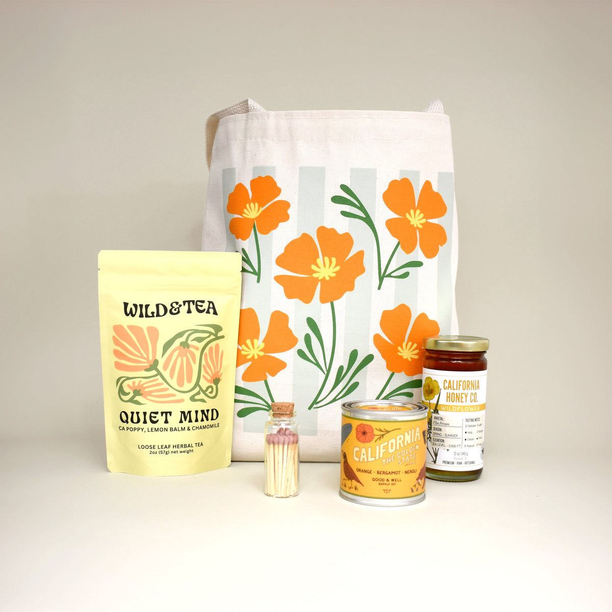 Sip soothing poppy tea sweetened with wildflower honey while warm notes of orange and bergamot create a sense of calm. Thoughtfully curated with a reusable cotton tote, small-batch goods, and sustainable design.