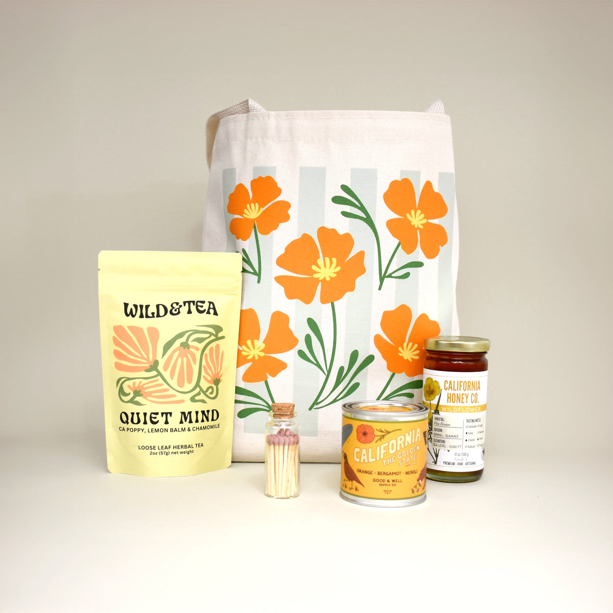 A California-inspired gift for quiet moments. Sip soothing California poppy tea sweetened with wildflower honey while the warming scents of orange and bergamot calm your senses. Comes in a beautiful cotton tote adorned with stripes and poppies, and the sweetest little glass vial of rose tipped matches.